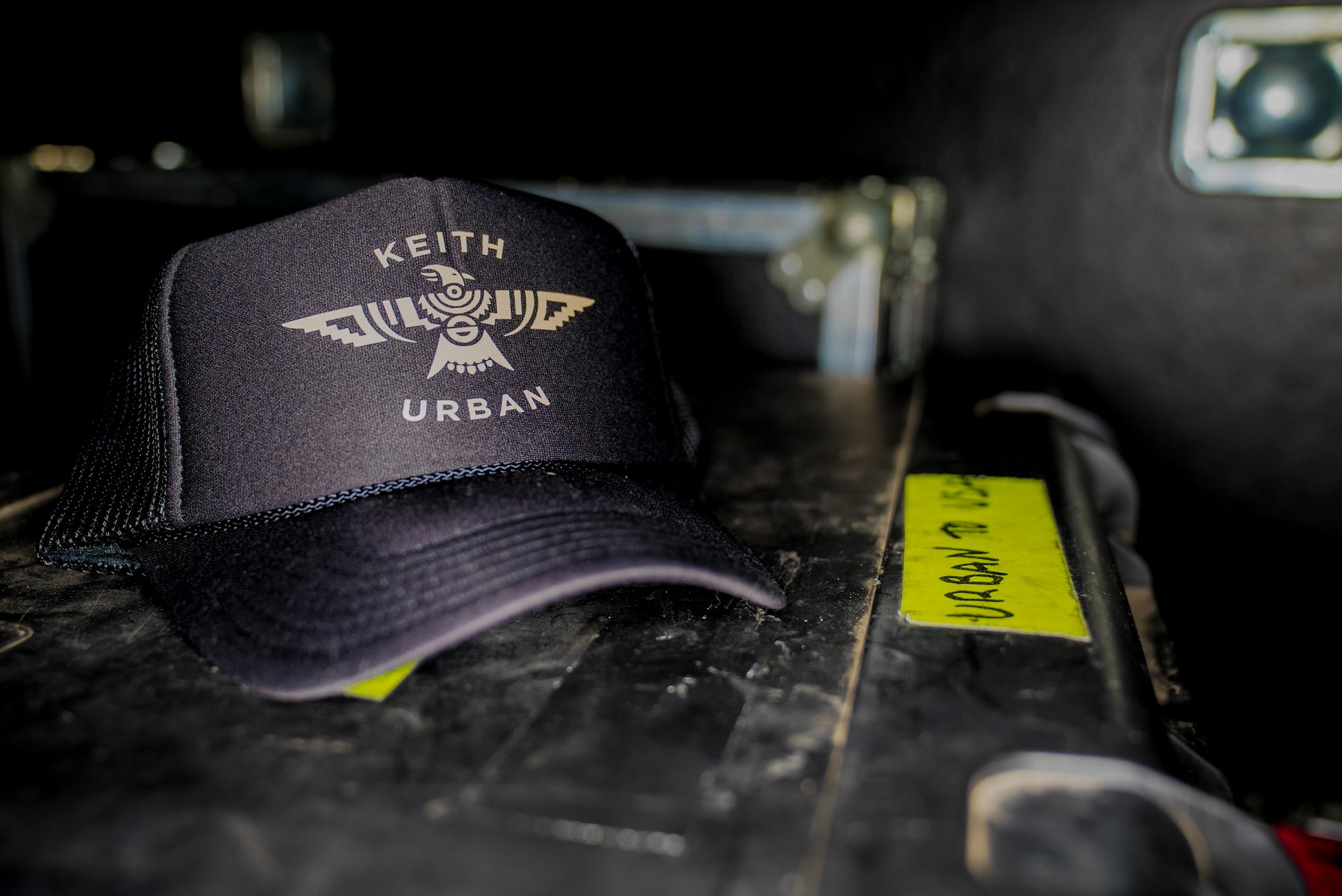 Black trucker hat with Keith's name and iconic phoenix logo printed on the front in dark tan